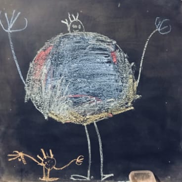 The picture my son drew was rudimentary, as pictures by five-year-olds tend to be. He was the little figure on the standing chalkboard, and I was the massive roundish blob, coloured between the lines in a sea of scratchy blue, edges in yellow and green, islands of white and the occasional red burst. As an afterthought, my son gave me thin arms and legs, the correct number of fingers and toes, a small head with sparse hair, but no neck to speak of. This makes sense, for this is all he can see from his usual vantage point far below me, craning his tiny head up in my direction.