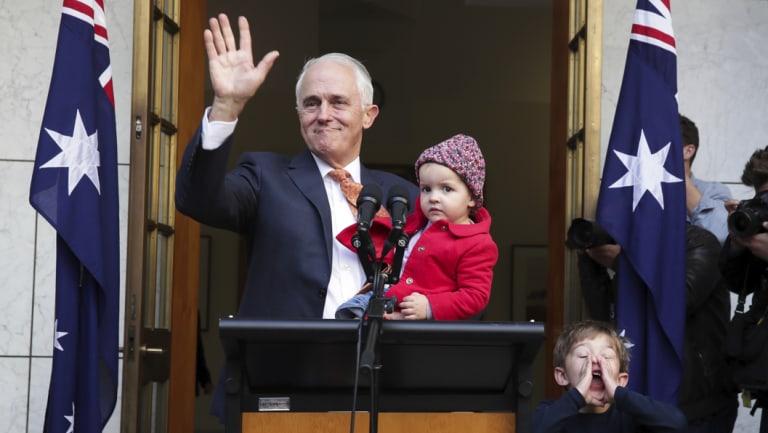 Malcolm Turnbull waves goodbye at the end of his final press conference as prime minister, surrounded by granddaughter Alice and grandson Jack.