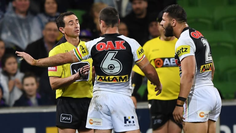 Penrith’s James Maloney (left) and Josh Mansour argue with the ref.