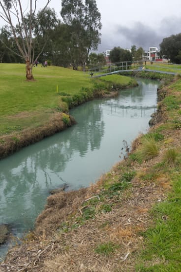 Stony Creek, at the Spotswood Golf Course, turned an unusual color as water from the firefighting efforts at the West Footscray factory blaze ran into it on Friday.