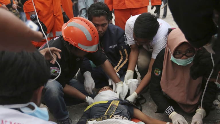 Rescuers check a survivor at restaurant building damaged by a massive earthquakes and tsunami in Palu.