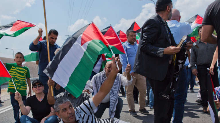Protesters fly Palestinian flags and chant anti Israel slogans.